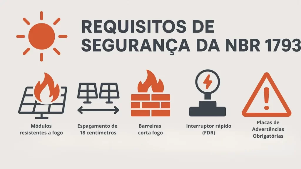 A Norma Técnica ABNT NBR 17193:2025 tem como objetivo indicar as medidas de prevenção e proteção contra incêndio e choque elétrico em sistemas fotovoltaicos em função de sua instalação em edificações. Ela estabelece requisitos e precauções para a instalação do sistema FV, principalmente relacionados à parte elétrica. Além desses tópicos que separamos, existem outras prescrições também muito importantes ao longo do texto da NBR 17193, portanto é indispensável que os profissionais não usem esse artigo como referência e sim a própria Norma Técnica. Um exemplo disso é o afastamento mínimo entre módulo e cobertura recomendado pelos fabricantes. A maioria dos fabricantes de módulos (não todos!) estabelecem a distância mínima de 10 cm entre os módulos e o telhado, porém, caso esse afastamento mínimo dos módulos para a cobertura não seja informado no manual do fabricante, a NBR 17193 recomenda adotar o afastamento mínimo de 18 cm.